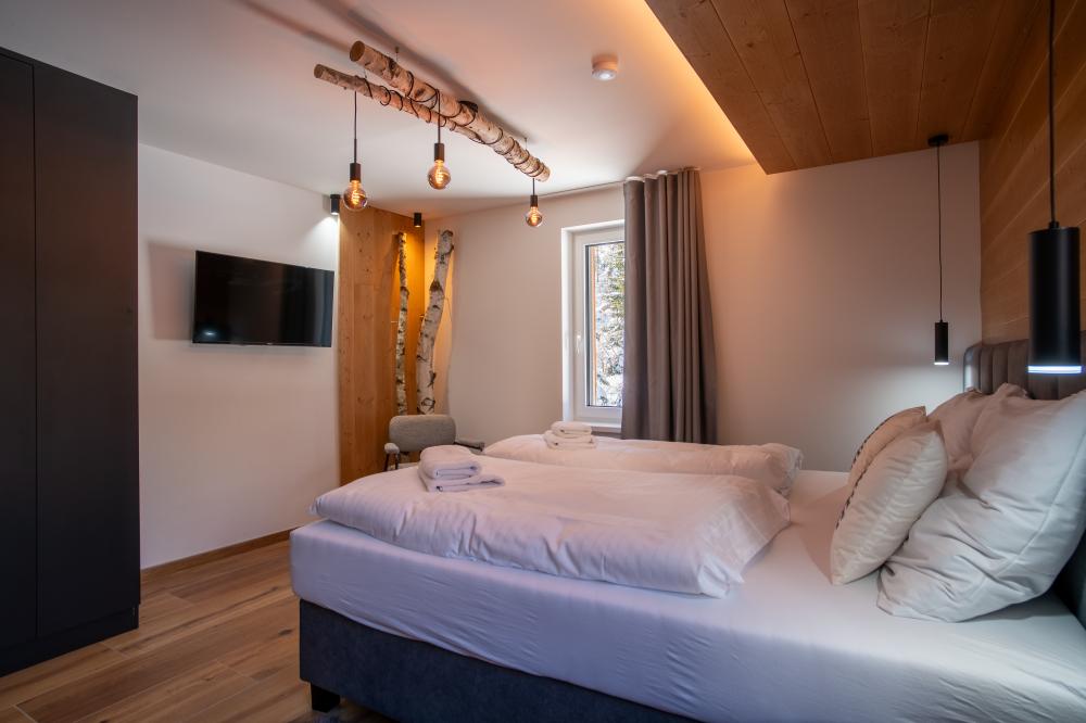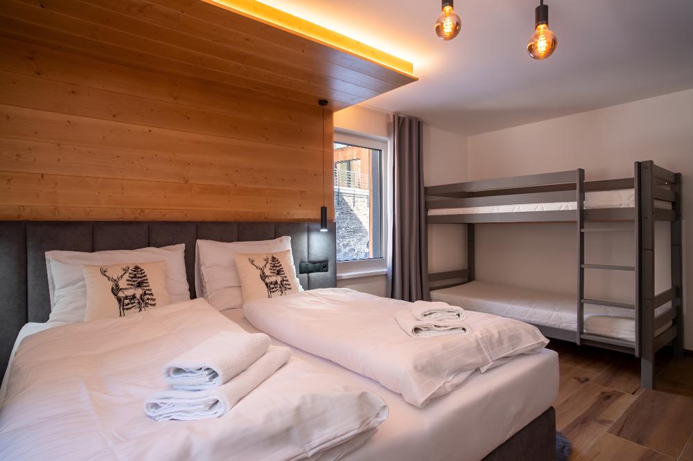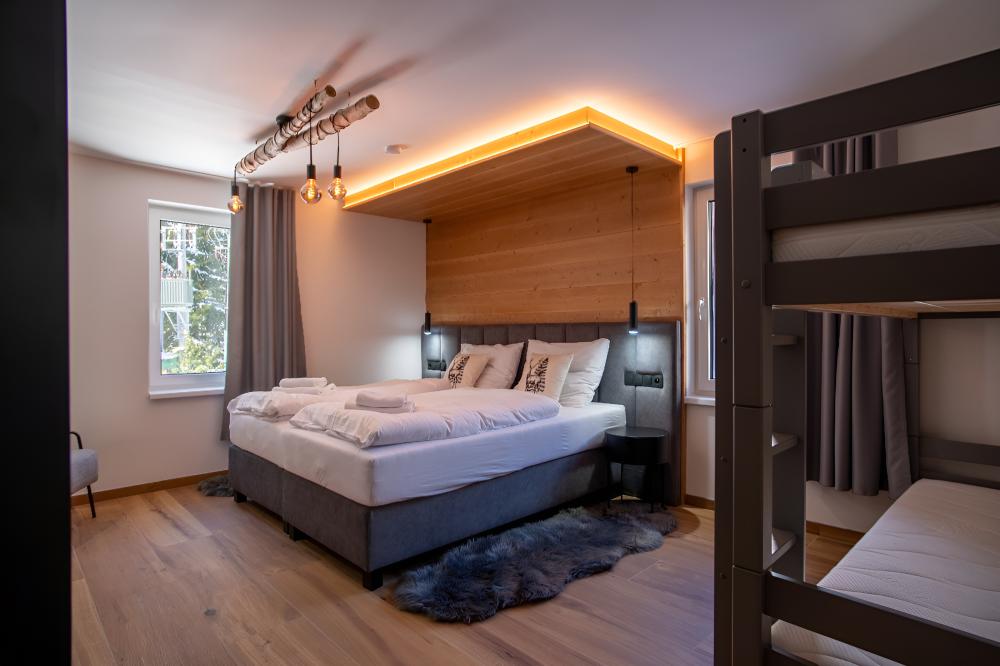 Deluxe Family Apartmán nabízí pohodlné a příjemné ubytování ideální pro rodiny nebo menší skupiny. Jeho dominantou je manželská postel doplněná o palandu, která poskytuje další komfortní lůžka pro děti nebo další hosty.