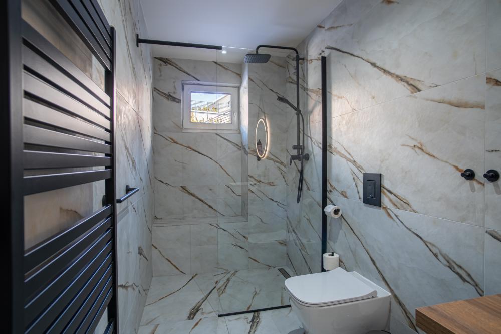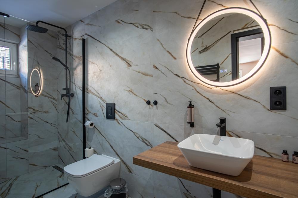 Součástí apartmánu je vlastní koupelna, kde hosté naleznou připravené ručníky i základní toaletní potřeby pro maximální pohodlí během pobytu. K dispozici je také skříň pro uložení osobních věcí.